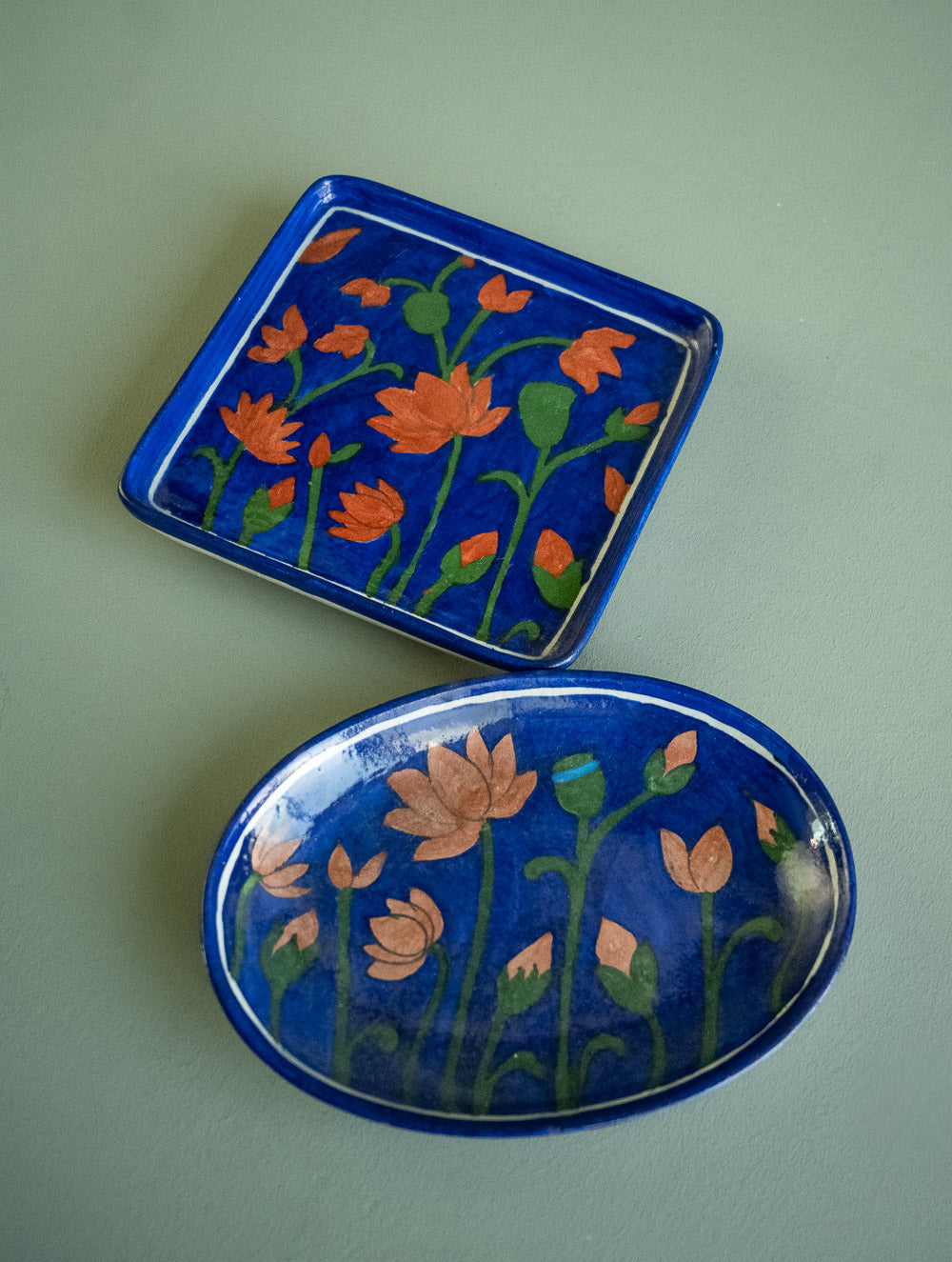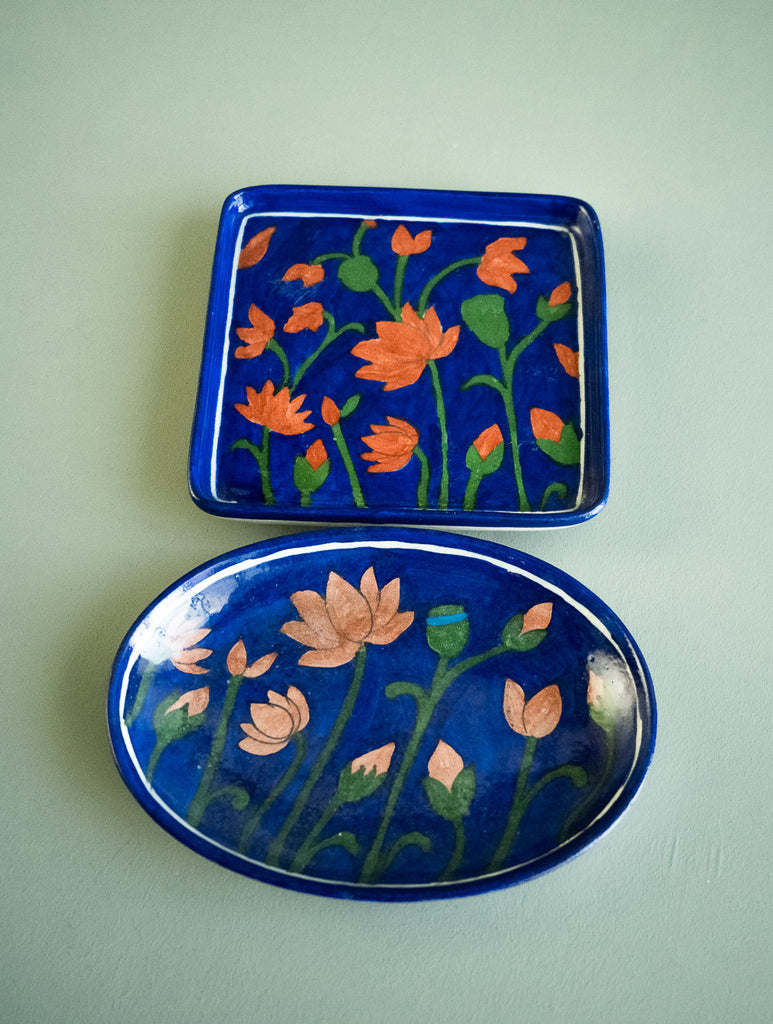 Jaipur Blue Pottery Serving Dishes Trays - Blue Lotus (Set of 2)