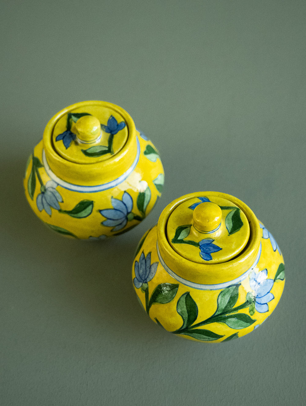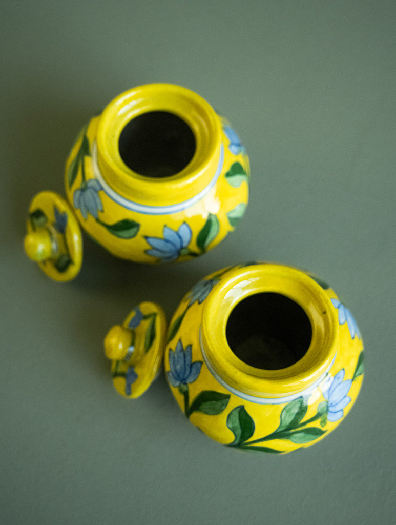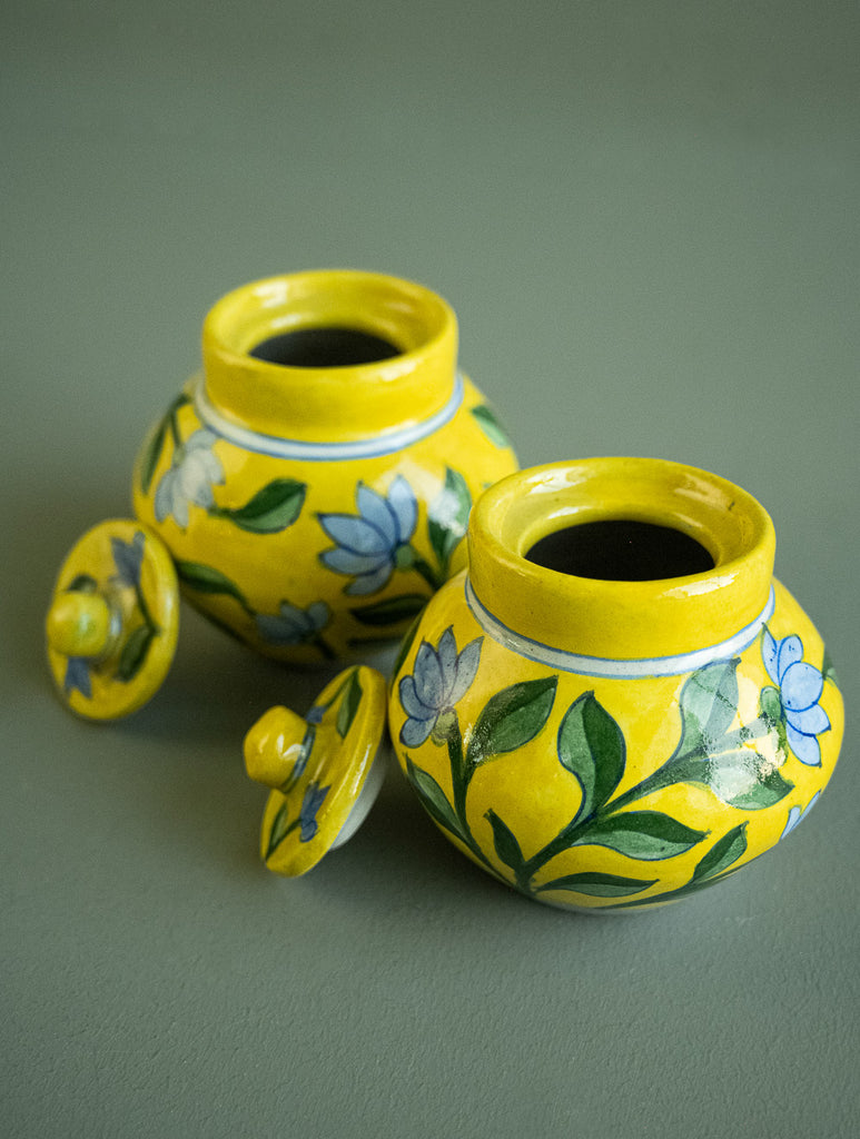 Jaipur Blue Pottery Small Jars with Lids - Yellow Floral (Set of 2)
