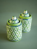 Jaipur Blue Pottery Small Jars with Lids - Yellow Floral (Set of 2). Add a splash of tradition and elegance to your kitchen or living space with these stunning Jaipur Blue Pottery storage jars. Handcrafted by master artisans of Rajasthan, each jar is made using a unique mix of quartz stone powder and natural gum, then hand-painted with intricate floral or geometric motifs in vibrant blue, green, and yellow hues. These jars are not only decorative but also functional, ideal for storing dry items like spices, tea, coffee, or snacks. The smooth glazed surface and fitted lids help keep contents fresh while showcasing the charm of India’s centuries-old pottery tradition. A perfect blend of beauty and utility, these jars bring cultural richness to any shelf or countertop.