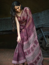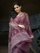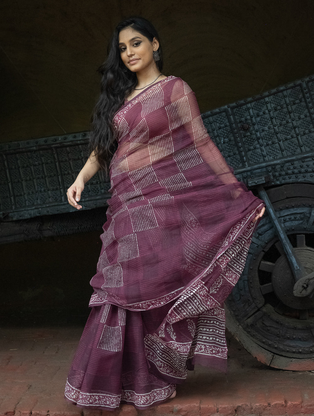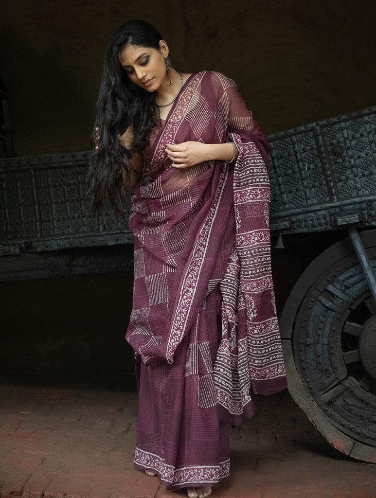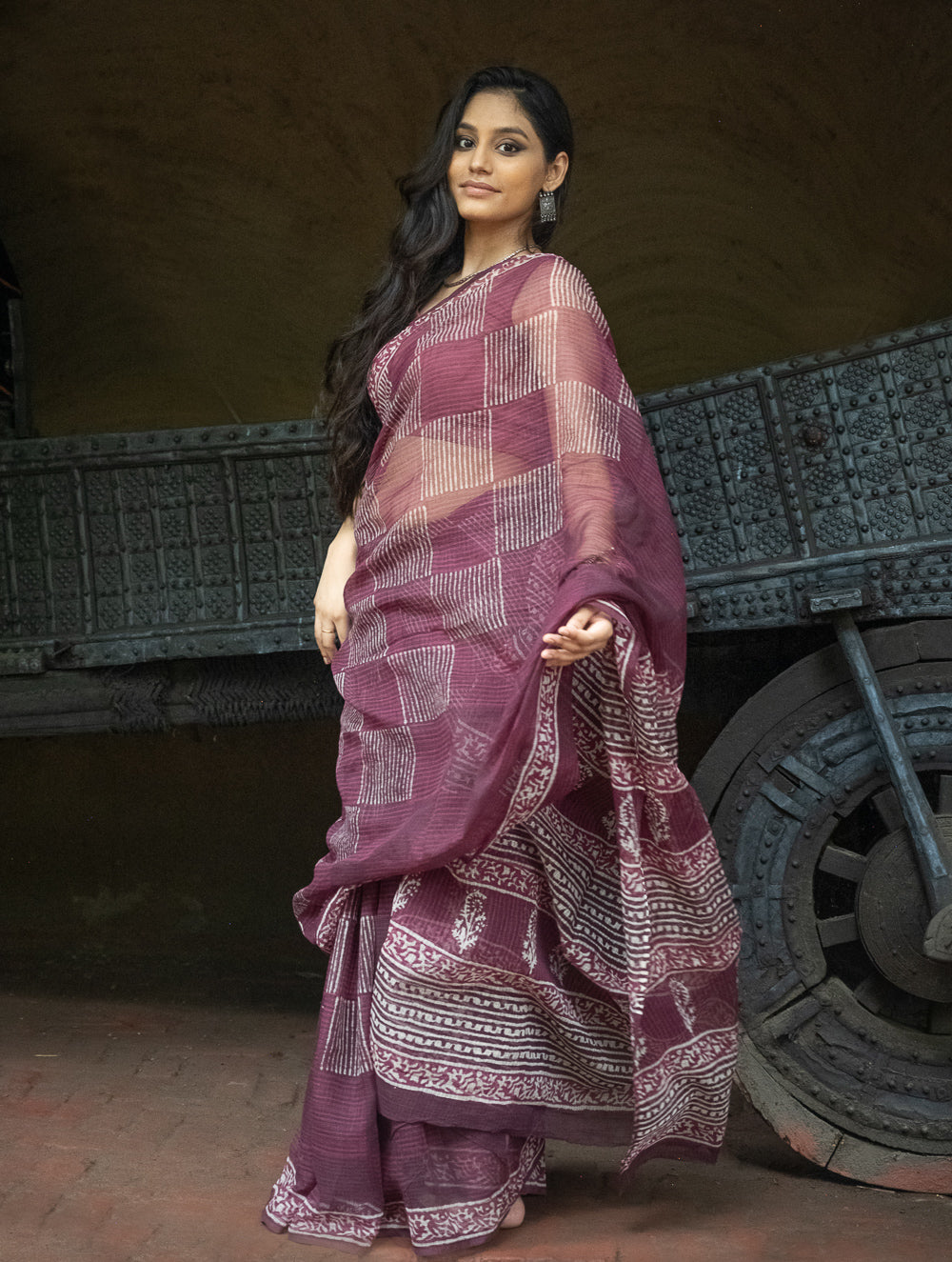 Dabu Hand Block Printed Kota Doria Saree - Maroon Geometric. A light, breezy and elegant style statement. A lovely and traditional block printing technique, Dabu printing is a resist dyeing process that entails the application of wax or gum clay mixed with resin to portions of the cloth, using a brush or block, followed by the application of colour.