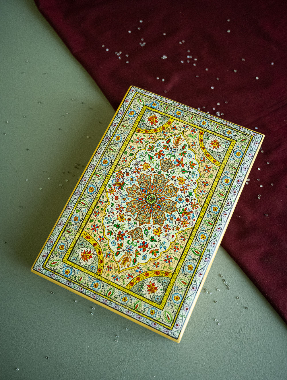 The Shahi Collection. Exclusive, Fine Kashmiri Art Utility Boxes - Purtazyeen (Large). Exclusive, Fine Kashmiri art box from an exquisitely hand painted range - 'The Shahi Collection'! Celebrate the artistry of Kashmir with these exclusive Kaaleen design Kashmiri boxes, inspired by the timeless beauty of traditional Kashmiri carpets, or 'Kaaleens'. An ultimate example of the unmatched talent and skill of Kashmiri artisans, drawing inspiration from their incredible legacy of art. This exquisite utility box with its old world elegance and charm leaves one mesmerised by the fine, intricate painting that adorns the box. Each box is a handcrafted masterpiece, featuring intricate patterns that echo the rich, floral motifs and delicate detailing found in classic carpet designs. Made from fine papier-mâché or wood, these boxes are perfect for storing jewelry, trinkets, or cherished keepsakes, while also serving as elegant decorative accents. The deep colors and ornate patterns reflect the soul of Kashmiri craftsmanship, making each piece a blend of functionality, tradition, and heirloom-worthy beauty.