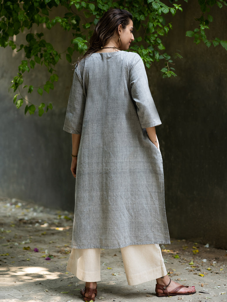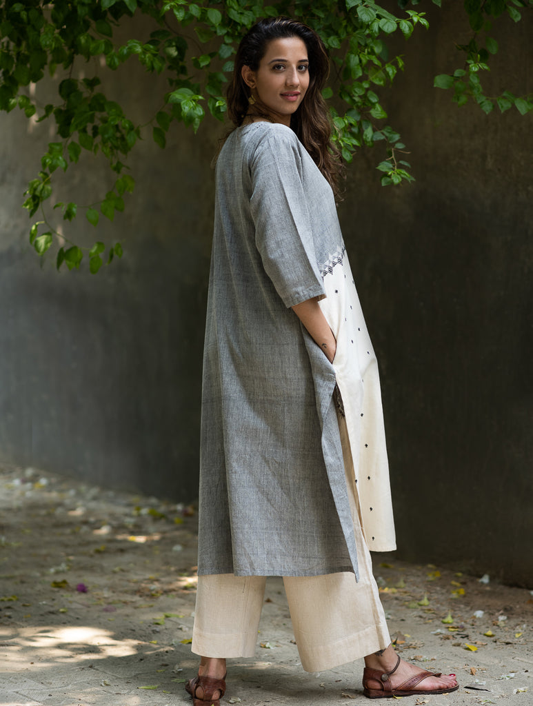 Handwoven Kashida Pattu Loose Kurta - Cream Aztec. A smart easy wear, loose-fit Kurta in comfortable cotton, crafted with beautiful and intricate Kashida weaving by the talented artisans of Rajasthan. Perfect for a day out or a relaxed evening! Sustainable, responsible clothing from our 'Craft Connect Collection . Smart and classy styles and silhouettes that stand out. Sustainable & entirely handwoven, this garment is an excellent choice that reflects a subtle elegance of its own. Handcrafted in the deserts of Rajasthan, Kashida weaving has become a major source of livelihood for the people of the region. NOTE: To help you get the best fit for this garment, we would strongly recommend you study the size guide carefully. For customised alterations, kindly contact us on +91 9311227797 once you have placed your order, to help us serve you better.