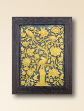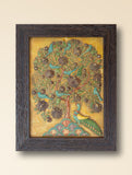 Hand-rendered Stone Dust Painting - Golden Dusk (10" x 8"/ With Frame). Framed in a majestic dark grey palette and rendered entirely in gradient golden tones, Golden Dusk evokes the architectural poetry of a regal court garden. Vibrant golden floral unfurl in jubilant symmetry, branching from a central tree motif recalling the classical Indo-Persian design. Stone dust painting is a refined traditional art form from the Indian subcontinent—particularly Rajasthan and the Deccan. It draws from ancient mural practices and the alchemical use of natural minerals as pigment. Finely ground stone powders, extracted from ochre, granites, and quartz, are applied onto handmade surfaces using natural adhesives, creating textured, enduring works with a naturally rich and nuanced palette. Historically confined to temple arts and manuscripts, this art form has evolved into a niche that speaks to the eco-conscious aesthete and cultural purists. These paintings are tactile compositions where each shade is a result of geology, patience, and artistic intuition and can be preserved for centuries.