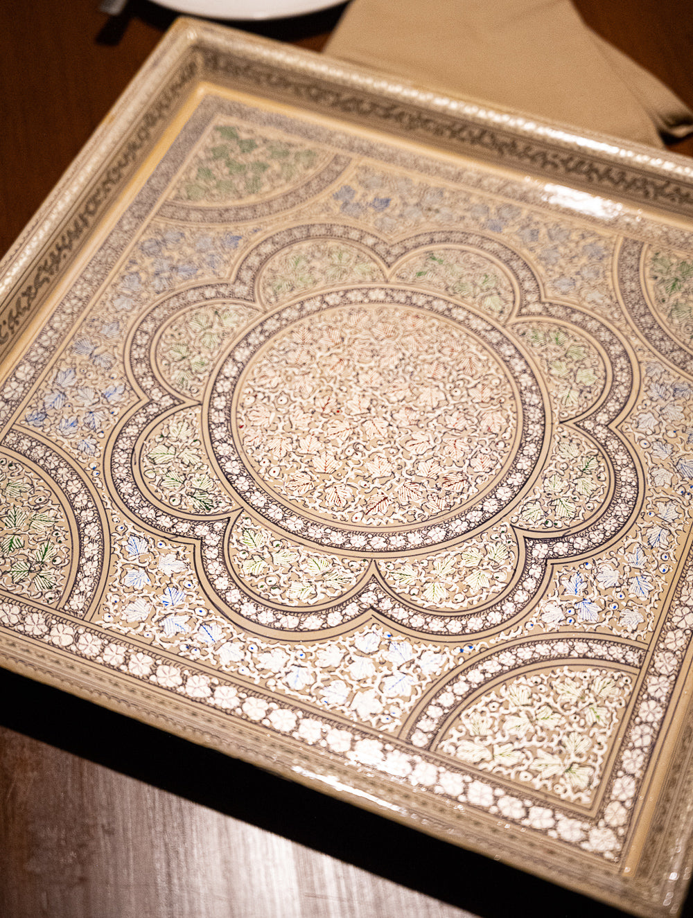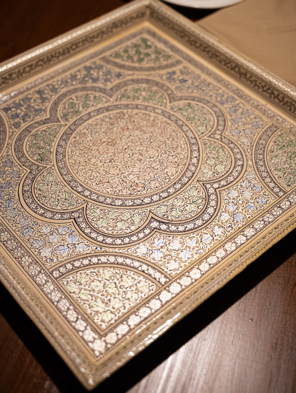 Kashmiri Art Tray - Ornate Flora. A beautiful desk accessory, this set is high on utility to hold your pens and stationery, mobile, phone, keys or other trinkets. These exquisite items have been hand painted by Kashmiri artists drawing inspiration from their beautiful legacy of art. Papier Mache is a delicate decorative art, born in the land of Persia and highly favoured by the Mughal Emperors of the 15th and 16th Centuries. The motifs of this art style are usually in the form of flowers and birds, with a strong Persian flavor. The art that was originally limited to papier mache, now also manifests itself on cloth, stone, wood and metal and a wide range of utility and décor items.
