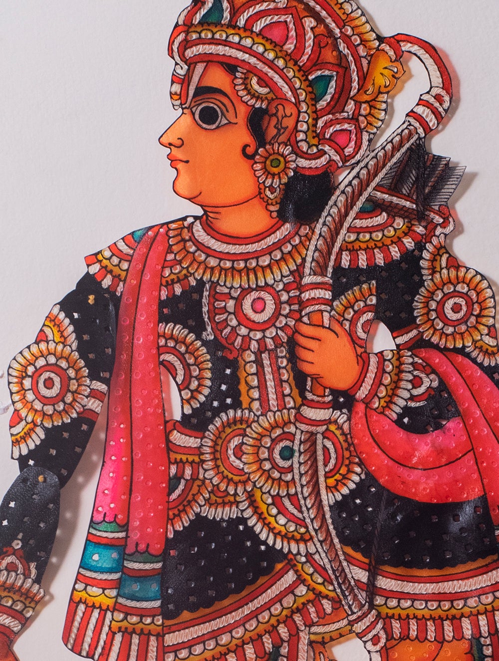 Andhra Leather Craft String Puppet - Lakshman (24" x 13"). A beautiful piece of wall decor, the limbs of this beautiful Puppet can be manipulated using strings. Leather Puppets of the shadow Puppetry Art form "Tholu Bommalata". The translucent leather painting art form from Andhra Pradesh was originally used to make puppets for the popular shadow-puppet theatre tradition of Andhra Pradesh -‘Tholu Bommalata’- literally meaning “the dance of leather dolls’. An ancient practice, wandering entertainers have for centuries disseminated the knowledge of Hindu epics and local folk tales to the remotest corners of the region, through this art form and tradition. This craft lends itself today to a range of items created by the artisans varying from paintings to lamp shades or the puppets as a vibrant and unique work of art to liven up a wall or a corner.