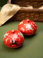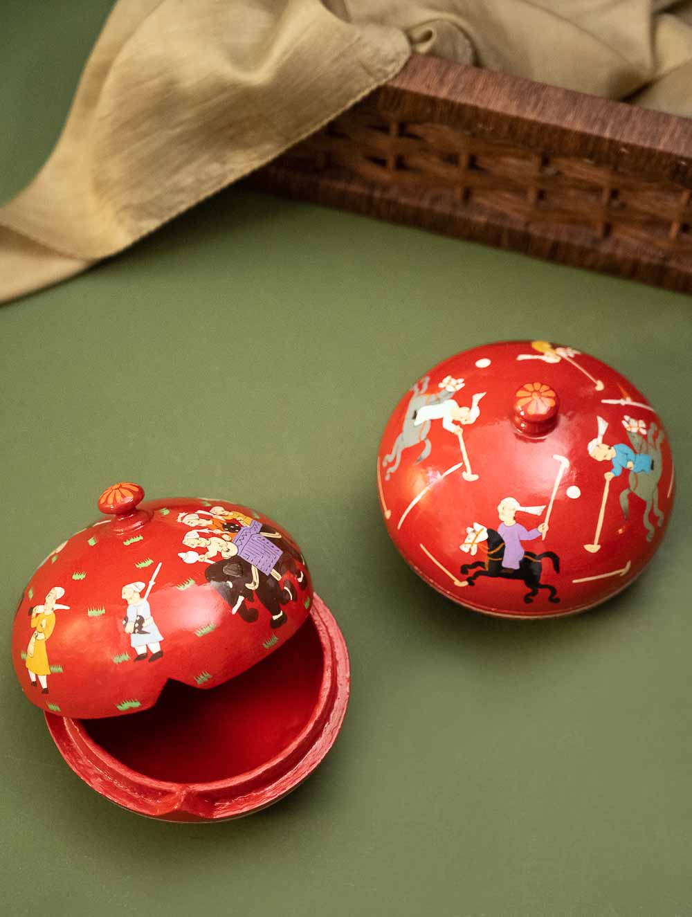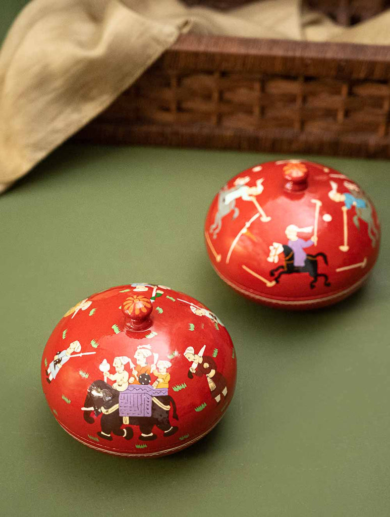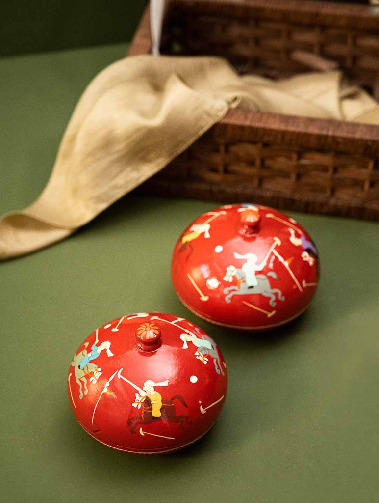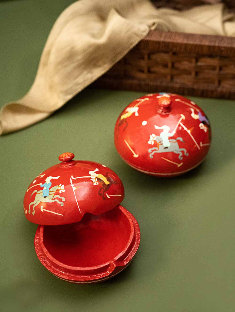 Exclusive, Fine Kashmiri Art Decorative Dome Boxes - Red Polo (Set of 2). These beautiful items have been hand painted by Kashmiri artists drawing inspiration from their incredible legacy of art. The Papier-Mache art form originally from Persia, was initiated in Kashmir with the art of paper making and writing in the 15th century, during the reign of Badshah Zain-ul-Abedin in Kashmir. The art now manifests itself on cloth, stone, wood and metal apart from moulded paper pulp. This exquisite art form has been adapted to create these exquisite items of beauty and utility.