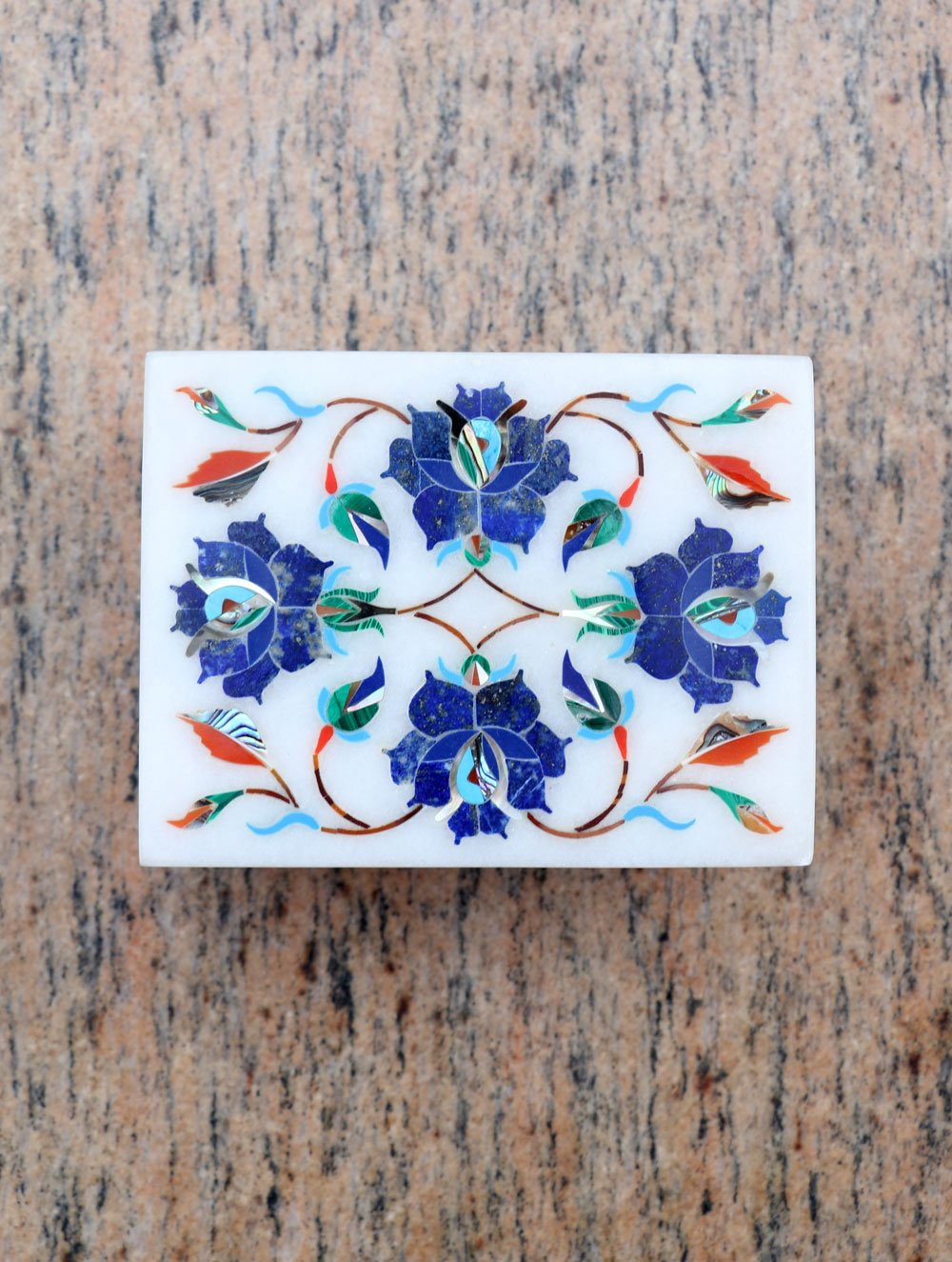Crafting beautiful artifacts and items of utility from Marble has been a skill coming down the centuries, the greatest evidence of which is stunningly visible in the Taj Mahal and other Mughal monuments of the time as well as at the Jain temples in the north and western parts of India. Of these, marble inlay craft is one of the oldest forms of craft from Uttar Pradesh. First a predefined pattern, like a floral or geometrical design is engraved on the marble slab. After this, small pieces of marble of different shades are cut delicately to precisely fit and are slipped into these grooves. Apart from marble, other stones are also used to adorn the marble inlay spaces. The origins of Inlay work can be traced back to Italy around the end of the 16th century. The craft known as "Pietra Dura" translates to 'hard' (dura) and 'stone' (pietra). This beautiful craft found its way to the resplendent Mughal courts of the Emperors in faraway India.